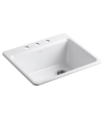 KOHLER K-5872-3A1-58 Riverby Single Bowl Top-Mount Kitchen Sink with Three Holes and Bottom Basin Rack, Thunder Grey . Product Features: Single basin design provides maximum available workspace Covered under Kohler's limited lifetime warranty Sized to fit in small spaces, this Riverby sink is an elegant and versatile addition to any kitchen as a primary, secondary, or utility sink An included custom-fit basin rack also helps protect the sinks surface from daily wear Constructed of enameled cast-iron which combines strength, durability and insulation benefits Top mount installation makes for a quick and easy install wile keeping the elegant you crave Offset drain location increases workspace area in the sink as well as storage area underneath All hardware needed for installation included Product Technologies / Benefits: Enameled Cast-Iron: Kohler Enameled Cast-Iron combines the strength, durability, and insulation benefits of cast-iron with the scratch, chip, and burn resistance of a baked, powder coat finish and comes with an exceptional Lifetime Limited Warranty. When these materials are combined it gives the sink or tub the strength to last a lifetime of use. Kohler Enameled Cast-Iron is also available in a wide variety of specialty colors allowing you to truly customize your home.Product Specifications: Height: 9-5/8" (measured from the bottom of the sink to the top most point of the sink) Overall Width: 22" (measured from the back outer rim to the front outer rim) Overall Length: 25" (measured from the left outer rim to the right outer rim) Basin Width: 15-13/16" (measured from the back inner rim to the front inner rim) Basin Length: 22-1/4" (measured from the left inner rim to the right inner rim) Basin Depth: 9" (measured from center of the basin to the rim) Installation Type: Top mount Number of Faucet Holes: 3 Drain Outlet Connection: 3-7/8" Minimum Base Cabinet Width: 25"
