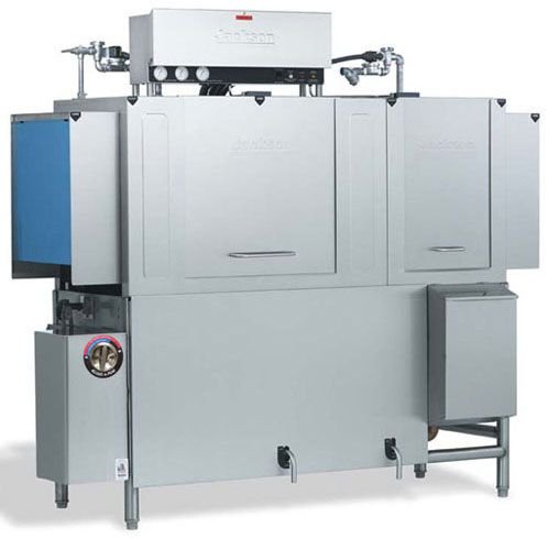 Jackson AJ-66, 248 Racks/Hr, Gas Tank Heat Conveyor Dishwasher w/ 22" Prewash - 0.94 gallons per rack hi-temp sanitizing rinse. 1.0 gallons per rack chemical sanitizing rinse. - Incoming water pressure regulator - Recirculating prewash feature virtually eliminates manual prerinsing and saves on labor. - Exclusive Adjust-A-Peak feature (patented) allows the owner operator to manually adjust the speed of the conveyor system from 124 racks per hour all the way to maximum capacity of 248/234 racks per hour. - Standard 25" clearance allows owner operators the ability to wash large utensils, trays, and bun pans. - Prewash section has two upper arms and one lower arm as opposed to one upper arm and one optional lower arm. - Totally electro-mechanical; no solid state controls utilized. - Fully automatic including auto-fill. - Prewash auto fill requires 110-140°F separate connection and does not fill through the booster heater. - Self-draining stainless steel wash pumps and impellers. - Exclusive "Energy Guard" controls system operates wash and rinse sections only when a rack is being washed or rinsed. - A long 18" wash section as well as 18" separation between wash and rinse produces superior results. - Convenient, externally operated lever drain. - Deep well scrap basket conveniently located on front of machine facilitates removal of heavy food soil. - Stainless steel frame, legs, adjustable bullet feet, and front appearance panel are all standard. - Standard 8" vent cowls/splash shields on both wash and rinse ends of the machine. - Heavy gauge construction for extra ruggedness and durability.