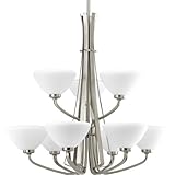 Progress Lighting P4643-09 Rave Collection 9-Light Chandelier, Brushed NickelThe Rave Collection features sweeping arcs framing elegant, etched opal glass. Cool and modern with a casual flair, Rave provides a signature look to any room. Unique stem-hung construction carries the clean line all the way to the ceiling and, for sloped ceilings, 6 in. chain is provided to allow the fixture to hang straight and level.