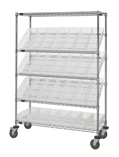 Quantum Storage Systems WRCSL5-63-2448-106CL 5-Tier Slanted Wire Shelving Suture Cart with 28 QSB106 Clear-View Economy Shelf Bins, 2 Horizontal and 3 Slanted Shelves, Chrome Finish, 24" Width x 48" Length x 69" Height?Genuine Quantum modular wire systems offer a unique combination of shelf and post sizes in a variety of finishes to compliment any application. The split sleeve and grooved numbered posts allow for easy and quick assembly. The all welded shelf construction is supported with architectural wire trusses to provide between 600 lbs and 800 lbs capacity per shelf. Unit also includes: 4 - 5" swivel poly stem casters, 2 with brakes, 4 donut bumpers. 1 Year warranty agianst defects.